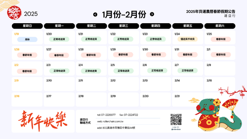 依行政院人事行政總處公告2025年政府行政機關辦公日曆表, 農曆春節假期自1月25日(廿六)至2月2日(初五)為期九天; 大榮貨運於1月24日至2月2日暫停收貨服務, 農曆年前最後送貨日為1月24日,並於2月3日(初六)起恢復正常營業。