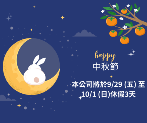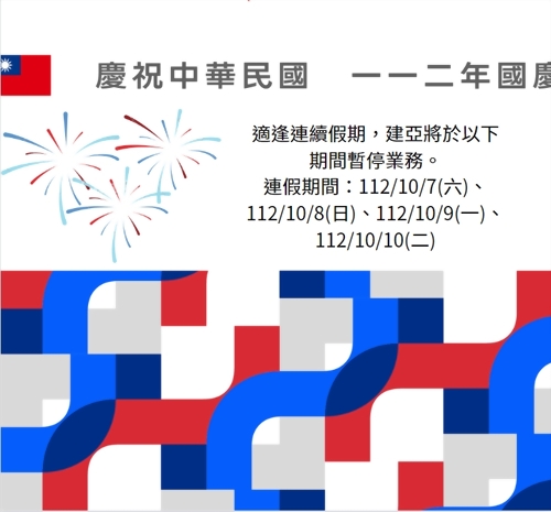 親愛的顧客,您好 10/07(六)-10/10(二)國慶連假期間將暫停出貨,感謝您的支持.