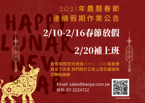 連假期間您可透過EMAIL, LINE或是傳真留下訊息, 我們將於正常上班日盡速與您聯絡謝謝. Email: sales@kaoya.com.tw 傳真: 07-2224722 LINE ID:@rollerchain Email: sales@kaoya.com.tw 傳真: 07-2224722